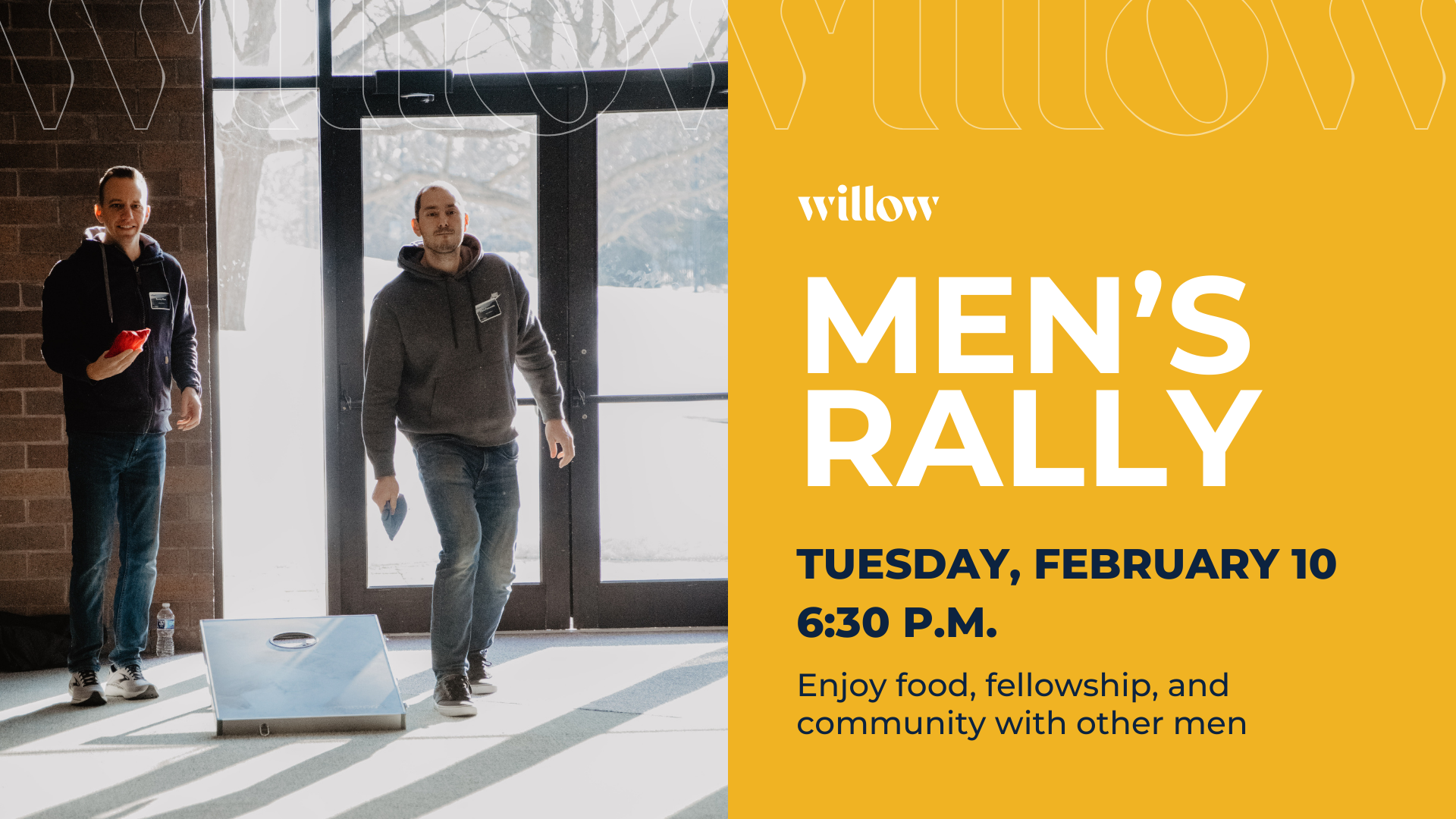 All men are invited to come together for an evening of food and fellowship on Tuesday, February 10 at 6:30 p.m. Come meet our new campus pastor Duane Calvin, hear an inspiring message, and discover new ways to connect with God and others this winter.